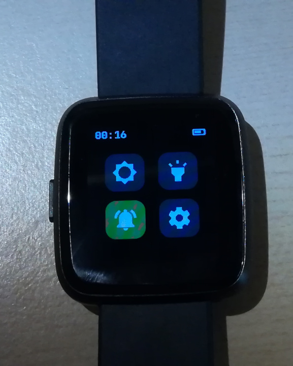 - Swipe up to display the application menus. Apps (stopwatch, music, step, games,...) can be started from this menu.